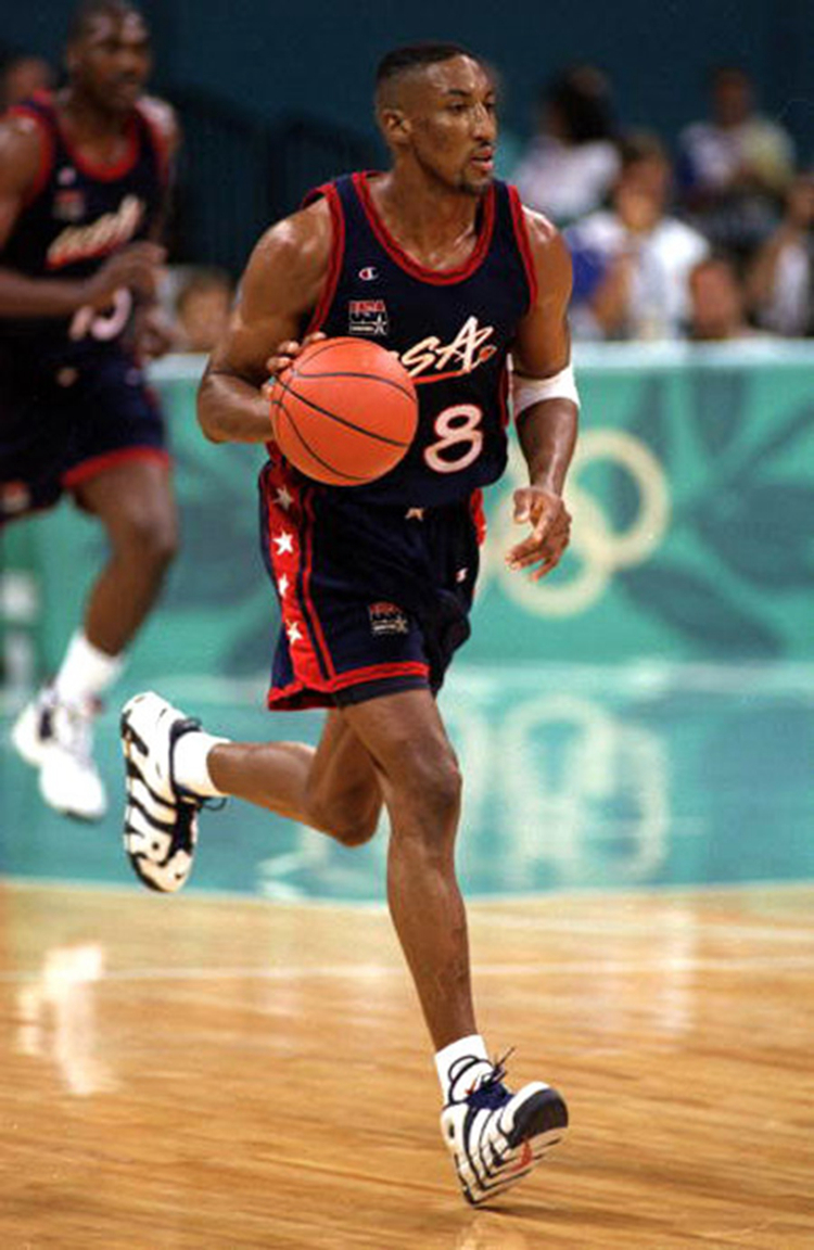 那除了这两个签名鞋系列之外,Nike今年还会带来两款经典鞋款的复刻。首先就是人气颇高的大Air,而且是最早亮相成为经典的奥运会配色。白蓝相间的搭配色契合了当时美国队的配色,后跟点缀一个金色8号刺绣logo象征着美国梦八队,有着满满的情怀记忆。