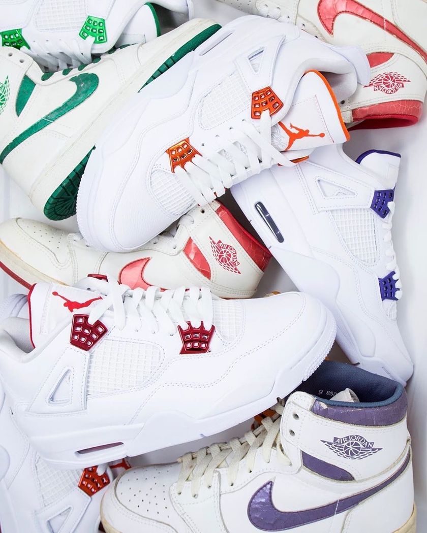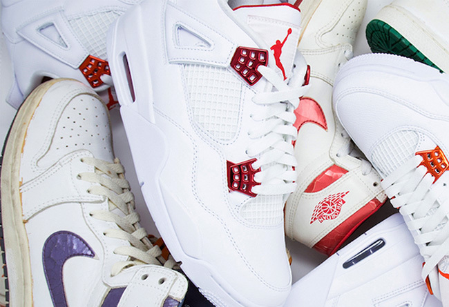 这一系列四款配色分别致敬 1985 年的 Air Jordan 1 元年“Metallic Pack”,其中 AJ 4 白红配色对应了 AJ 1 白红。一袭纯白皮革搭配金属光泽红色细节点缀,清新百搭之余还别有一番时尚活力气息。