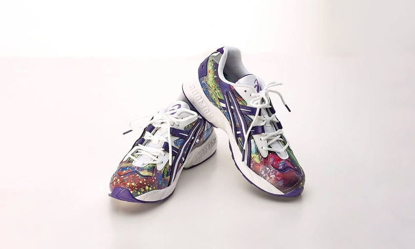 作品以 GEL-Kayano 5 这一经典鞋型为蓝本塑造,紫色基底融入泼墨元素和抽象油画一般的繁复图案,吸睛度爆棚的同时还极具艺术气息。