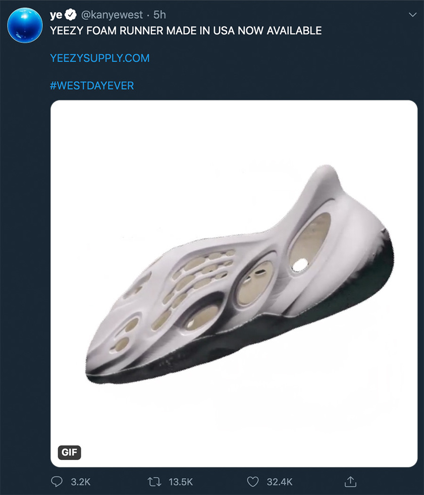 除了宣告与 GAP 的重磅合作外,昨日 Yeezy 还有一个大动作,就是在 yeezysupply.com 官网突袭发售了Yeezy“洞洞鞋” Yeezy Foam Runner 。
