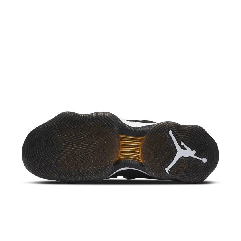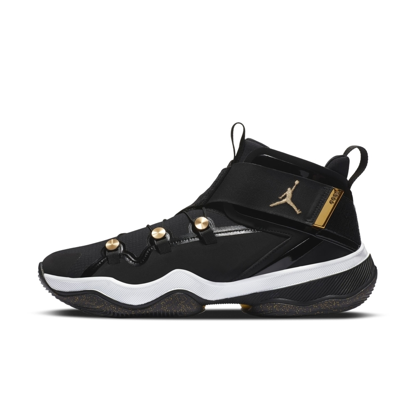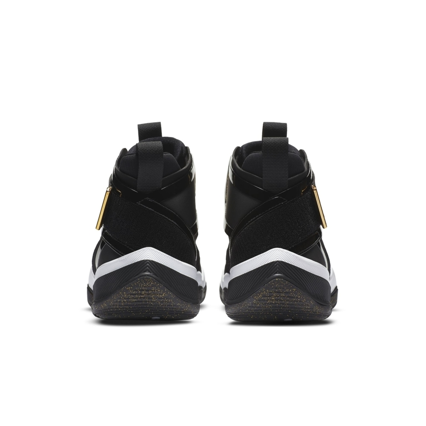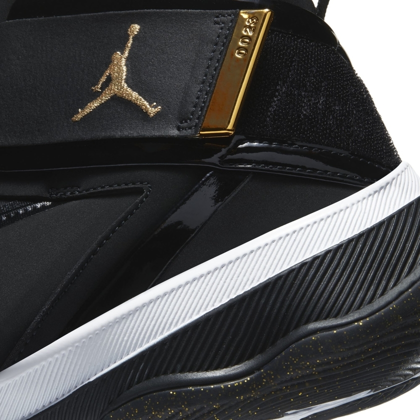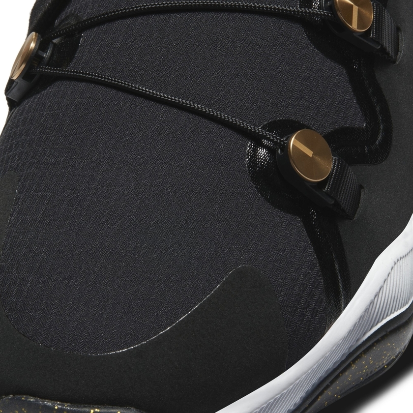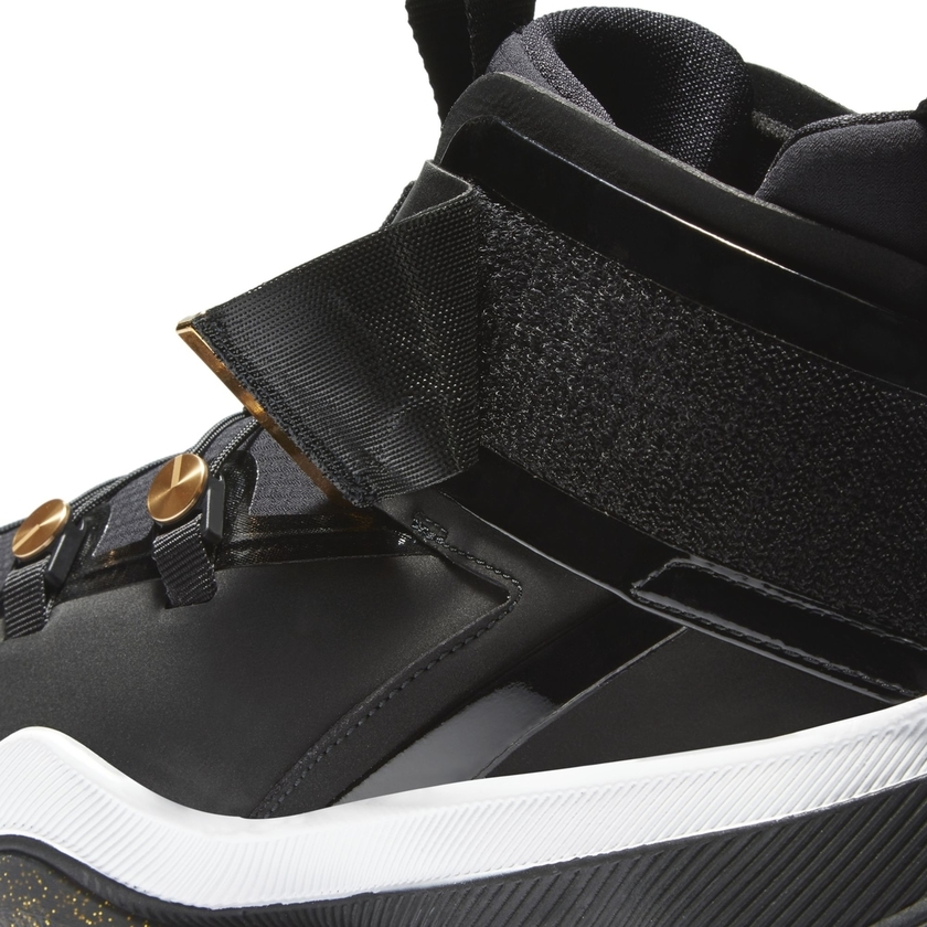 整双鞋采用经典黑金色调主打,整体造型乍一看颇像高帮 Air Jordan 11 。机能感十足的鞋带系统,搭配魔术贴绑带设计,营造出前卫时尚感。黑色漆皮材质与金色细节的点缀,则带来华丽高贵气质。