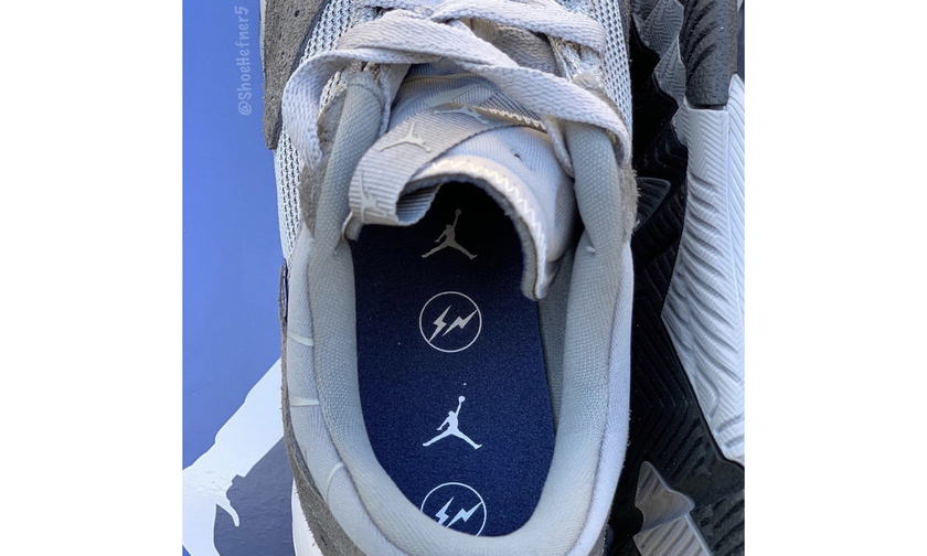 这款联名以蓝灰色主打,其鞋面采用网面、麂皮材质以及热熔补强材质塑造。 Fragment 双闪电标志出现在鞋舌、后跟、鞋垫处,与 Jordan 标签一同表明联名身份。