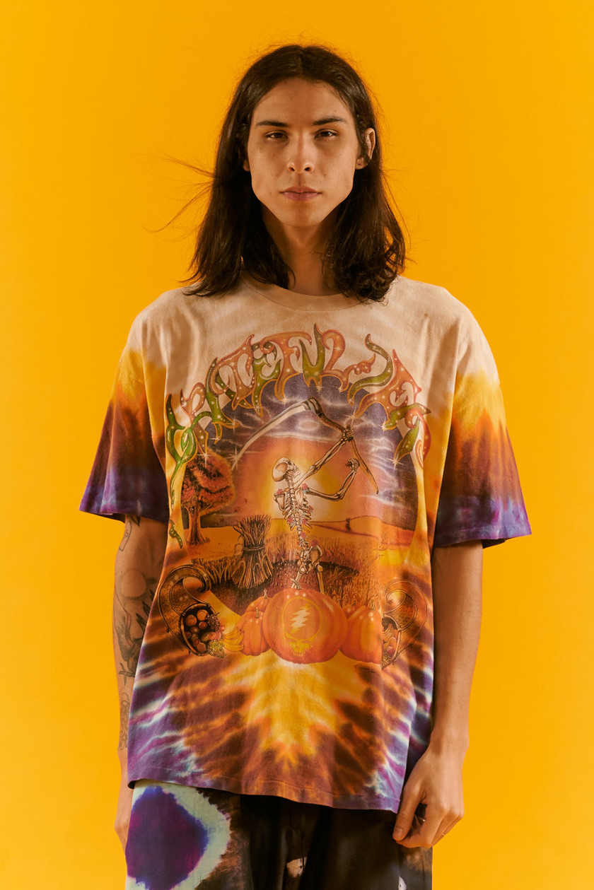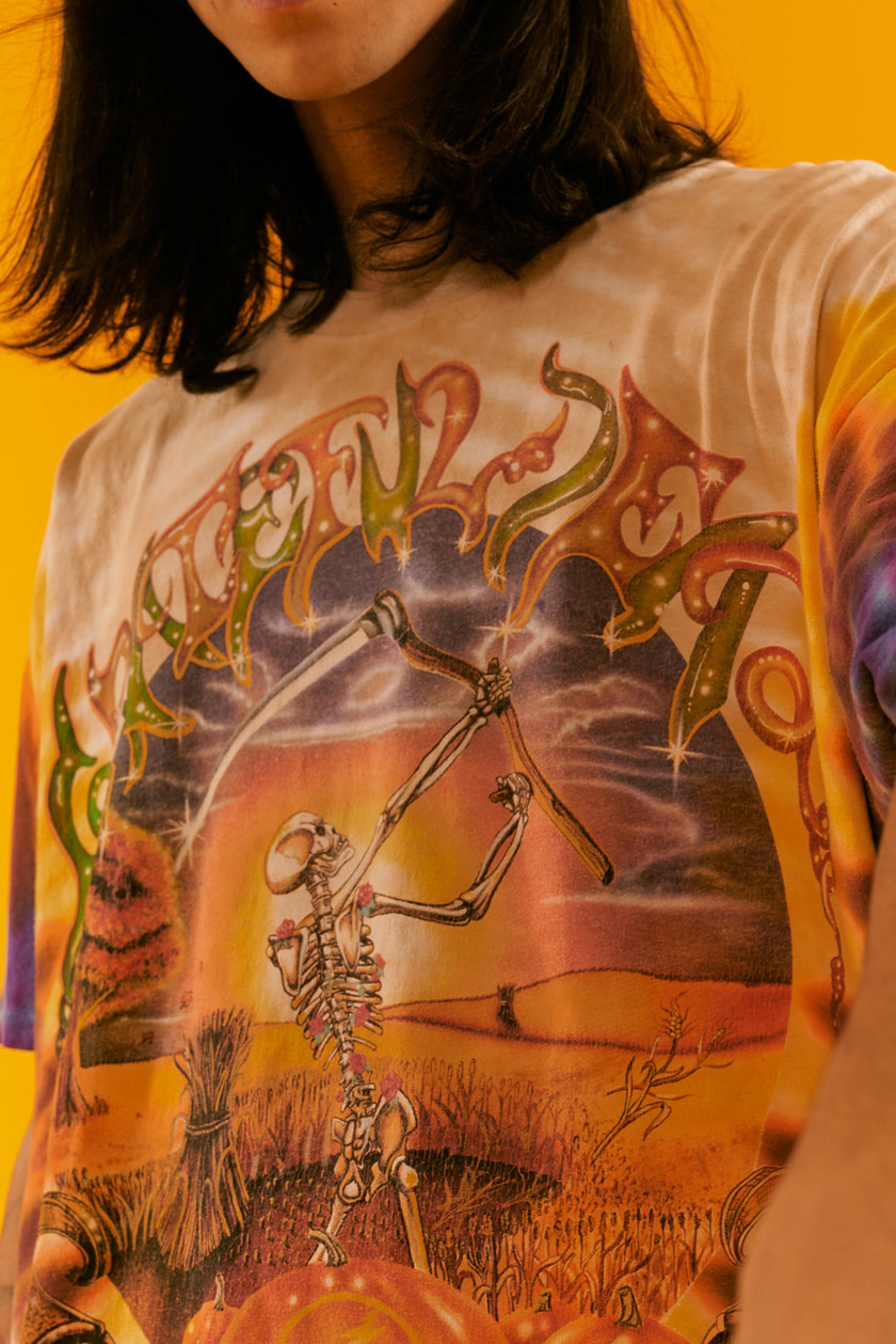 系列从80 与 90 年代 T恤和图案中汲取灵感,将标志性的扎染设计和迷幻插图注入,且每件限量 T恤均包含手写印花,解释了特定 T恤的背景、最初制作年份和发现地点。