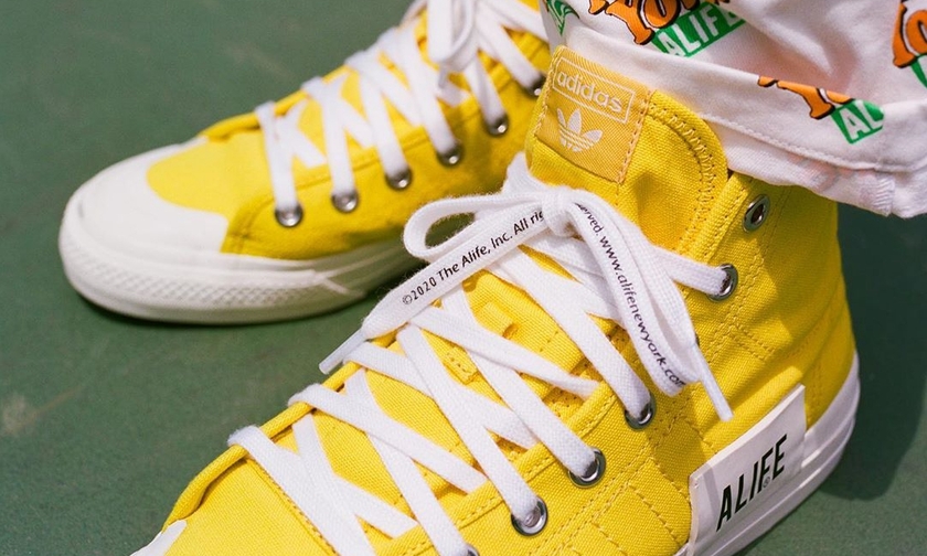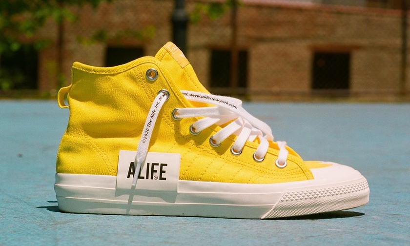 近日,携手美国街头品牌 Alife ,adidas 推出了两款全新的 Nizza Hi 联乘鞋款。鞋款分别采用柠檬黄和黑色为主打,搭配白色鞋头与中底部分,撞色拼接效果明显。