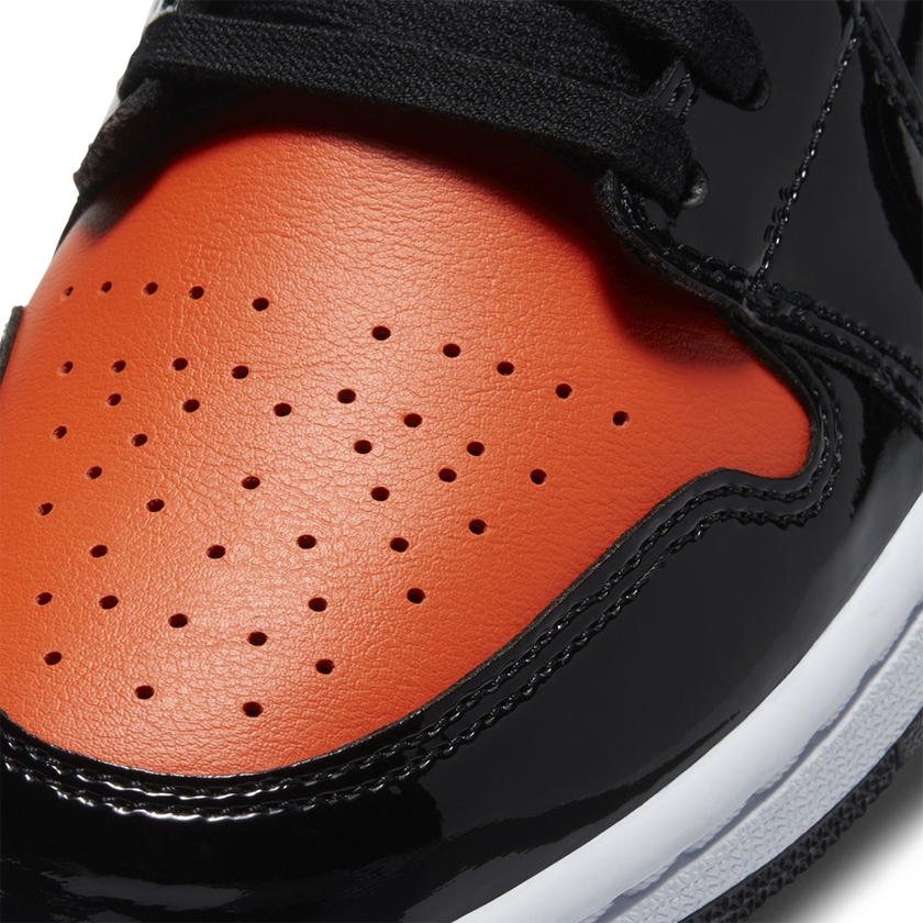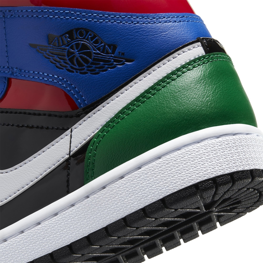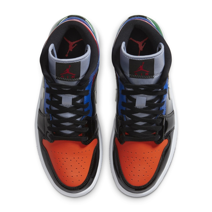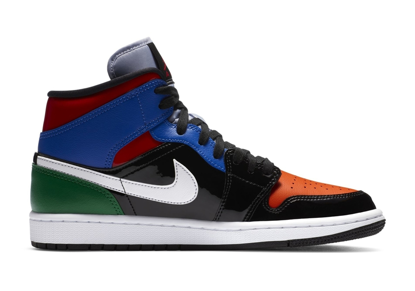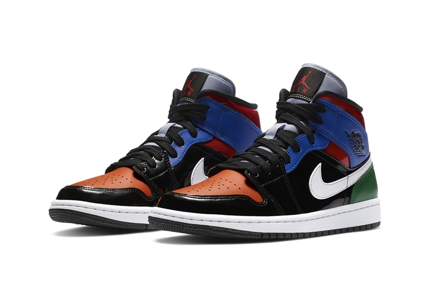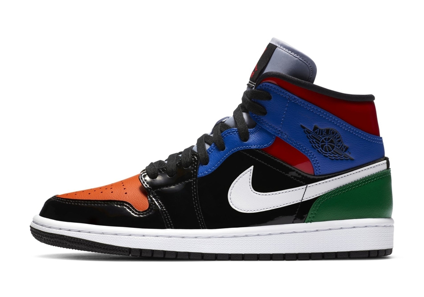 这款配色采用黑色漆皮为主打,橙色、蓝色、红色、绿色等高饱和度色调皮革拼接,吸睛度极高。也酷似融合了闪电、芝加哥、黑绿等经典人气 AJ 1 配色。