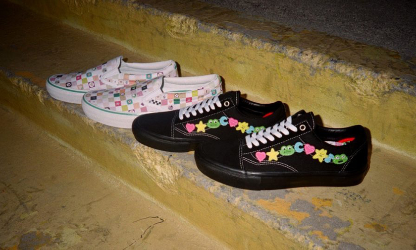 可以看到 Old Skool 以纯黑鞋面示人,鞋面饰有青蛙、爱心、星星等卡通元素,而 Slip-On 则以棋盘格+卡通元素的形式呈现,两双鞋吸睛度都极强。