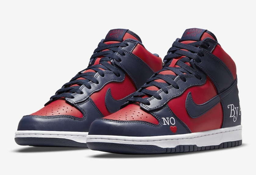 最近 Supreme 与 Nike 再度合作推出了一款以 SB Dunk High 为基础打造的全新联名鞋款。整个鞋面以红色和深蓝色拼接打造,鞋身遍布细节,包括鞋侧的 “NO” 字样和桃心图案、鞋舌标签的 SUP 特殊字样、后跟处的 “BY ANY MEANS” 字样以及 Supreme Team 刺绣,视觉效果十分出众。据悉这双全新的 Supreme x Nike SB Dunk High “By Any Means”会在今年年内正式发售,具体发售信息目前