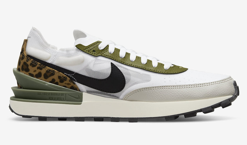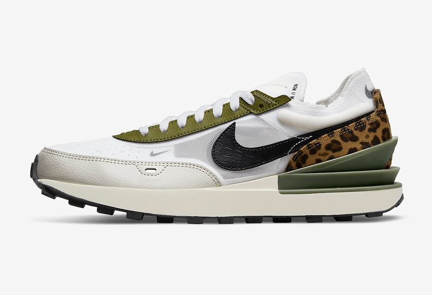 最近一双全新配色的 Nike Waffle One “Safari” 公布了官图。整双鞋以白色为基础,搭配辨识度极高的蜥蜴皮纹理的黑色 Swoosh、后跟处的豹纹贴片和橄榄绿色细节,以及米白色中底和黑色橡胶外底,视觉效果十分出众。据悉这双全新的 Nike Waffle One “Safari” 会在近期正式发售,发售价格为 100 美元。